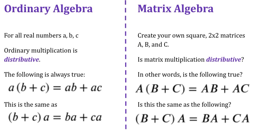 It is well known fact that Multiplication of matrices is distributive with respect to the matrix addition. A division algebra is basically an algebra in which multiplication has an inverse. A 1 2 0 1 B 0 1 1 1 C 2 0 0 1.